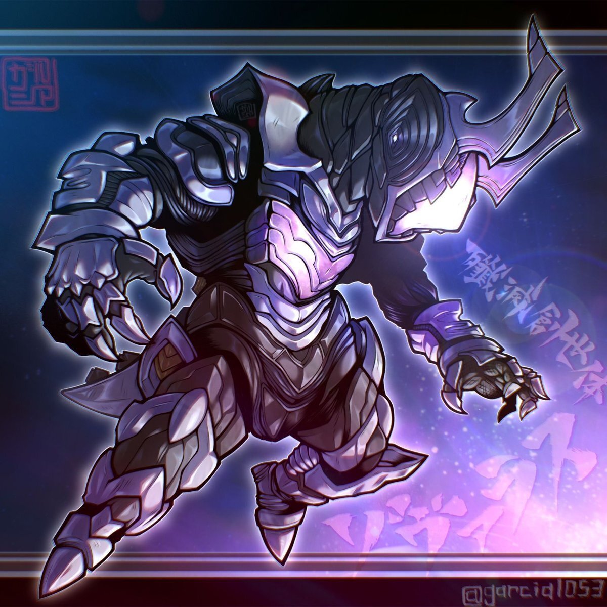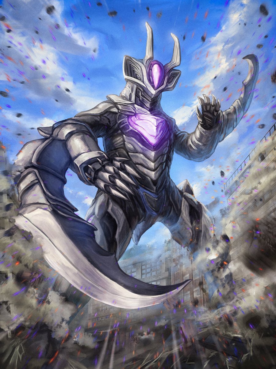 #ウルトラマンオメガ 第14話に登場した殲滅創世体ゾヴァラスを描きました。 1話冒頭、赤い巨人を見つめる者…というイメージで制作。両腕の武装やハルバード持ちも描きたかったけど、今回はとにかく素の格好良さで勝負! pic.x.com/LerlqxroyF
