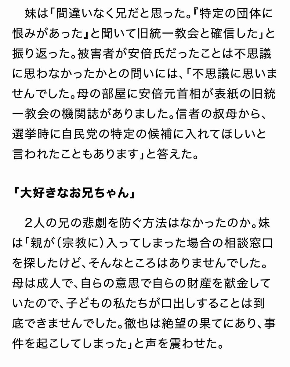>妹「母の部屋に安倍元首相が表紙の統一教会の機関誌があった。母の妹も統一教会の信者だが、選挙の時に自民党候補者に入れてほしいといわれたことや、(安倍氏が教団の友好団体に寄せたビデオメッセージ)映像も素晴らしいからぜひ見てほしいといわれたこともあった」