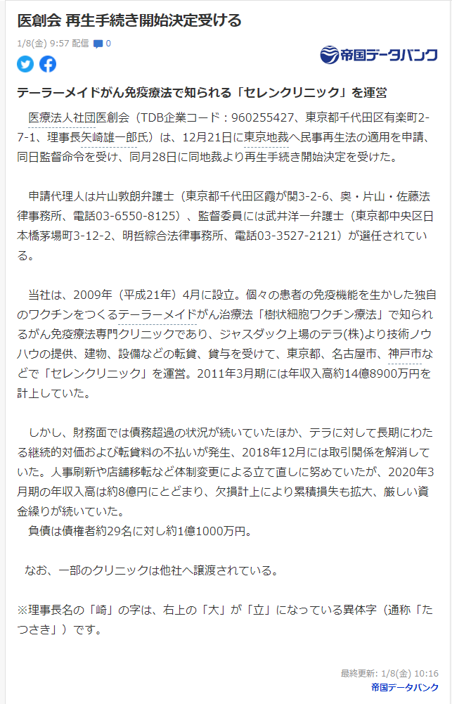 「医創会 再生手続き開始決定受ける」 news.yahoo.co.jp/articles/31d9e… >テーラーメイドがん免疫療法で知られる「セレンクリニック」を運営 / 医療法人社団医創会(TDB企業コード:960255427、東京都千代田区有楽町2-7-1、理事長矢崎雄一郎氏)は、12月21日に東京地裁へ民事再生法の適用を申請 pic.x.com/k6BPS4y5wc
