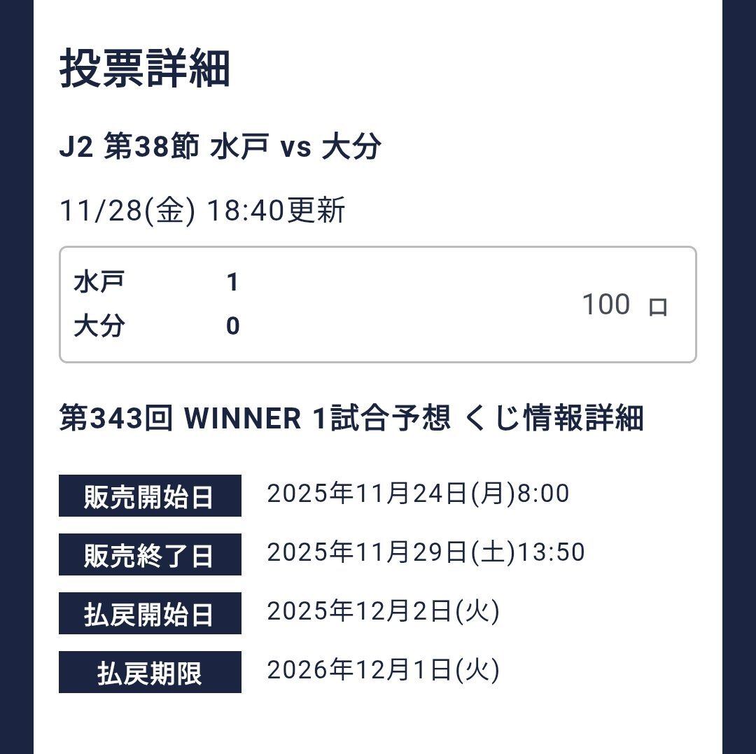 ついに明日は決戦、ジェフは勝たなければ何も起こせない! フクアリはドラマが起きる、起こす! 現地で応援しますのでよろしくお願いします🙇‍♂️ くだらないことですが、水戸対大分が1-0のWINNERを買いました。 私は逆神なのでこれは当たらないはず、、 水戸が勝つには2点以上必要になる裏技です😂