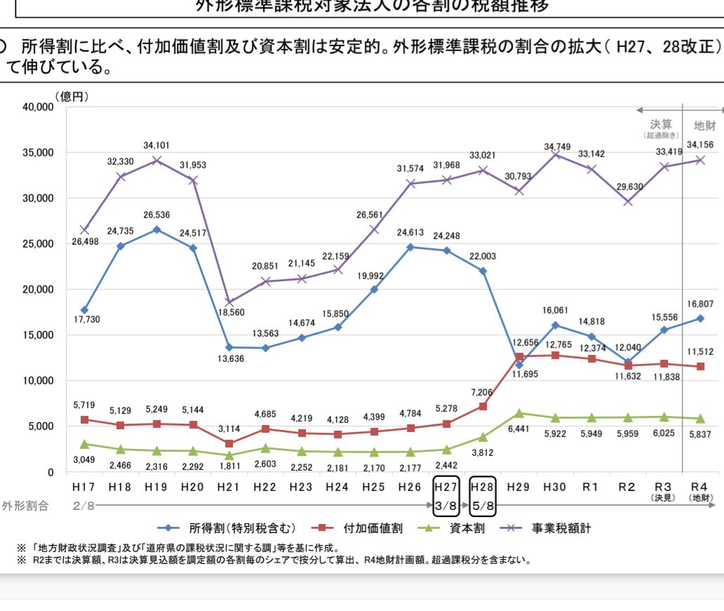 返信先:@pqQISYRTbj8S02c他1人たしかに国税としての法人税率は下がってますが、 少なくとも5→8%に上がった後に、 大企業のみに課される外形標準課税が増えています。 全ての企業の法人税収が10兆程度という中で、 大企業だけが負担する外形標準課税が1.5兆です。 大企業の負担はむしろ高い。 pic.x.com/xa4ZssIUtn