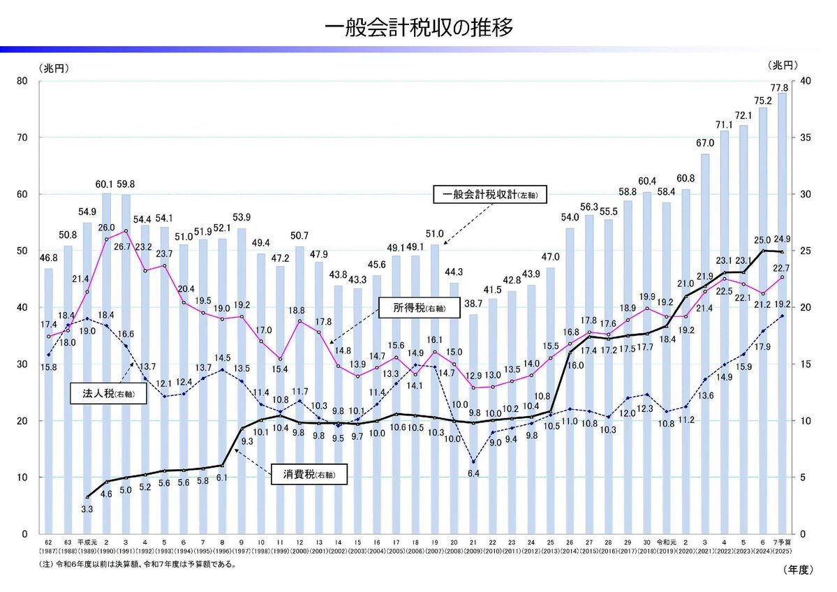 35年前の物価と今の物価を比較したら、今の方が物価が高いのだから、法人税もそれに比例して上がっていなくてはならない。 物価の上昇率に比べて税収の伸びが低くければ、実質的な税収はむしろ減っているということ。 x.com/ayano_kunimits…