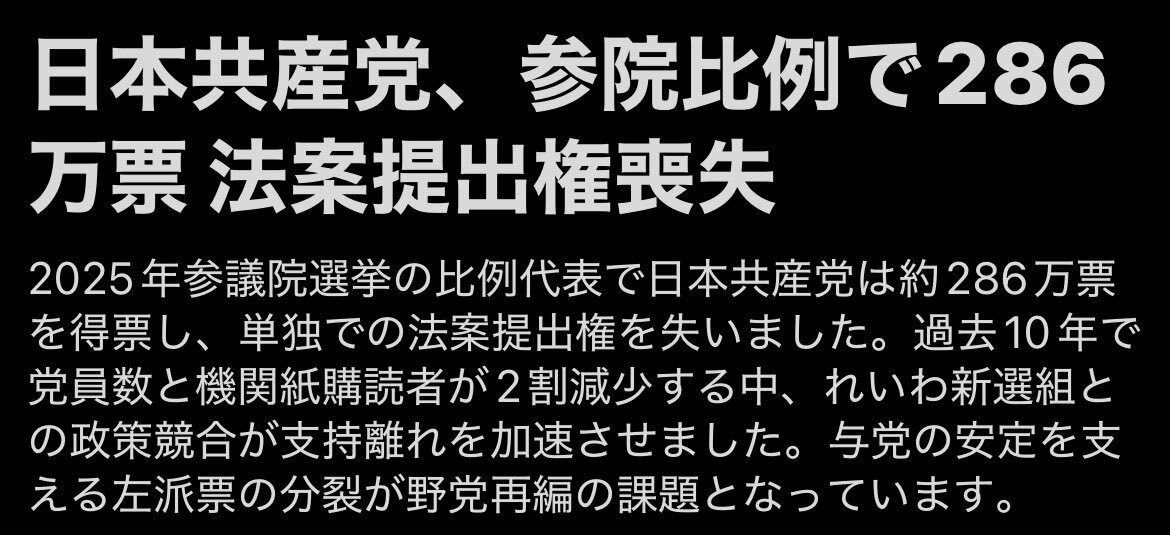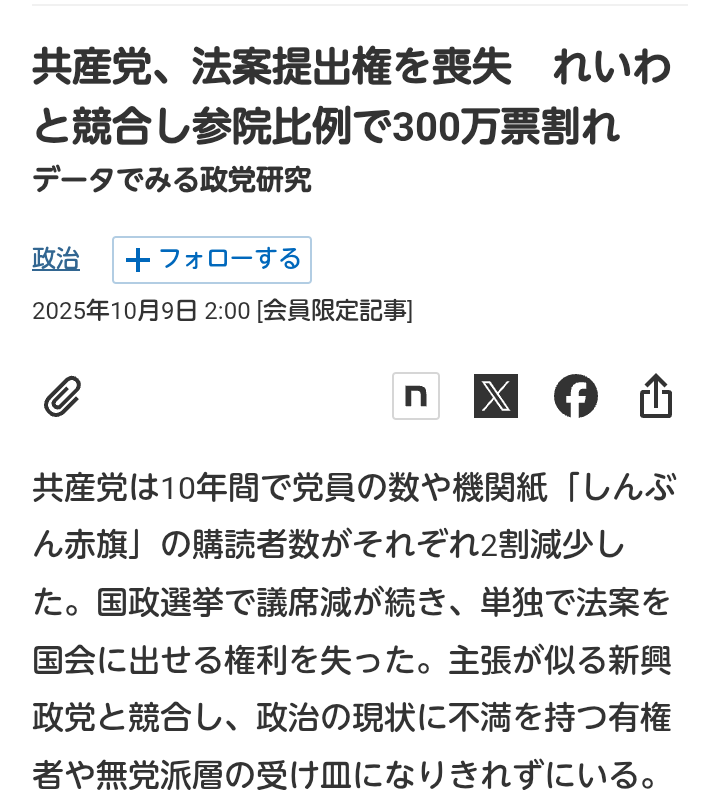 共産党は参院選で300万票を割り、法案提出権を喪失 めっちゃ評価されてますねー x.com/dgoutokuji/sta…