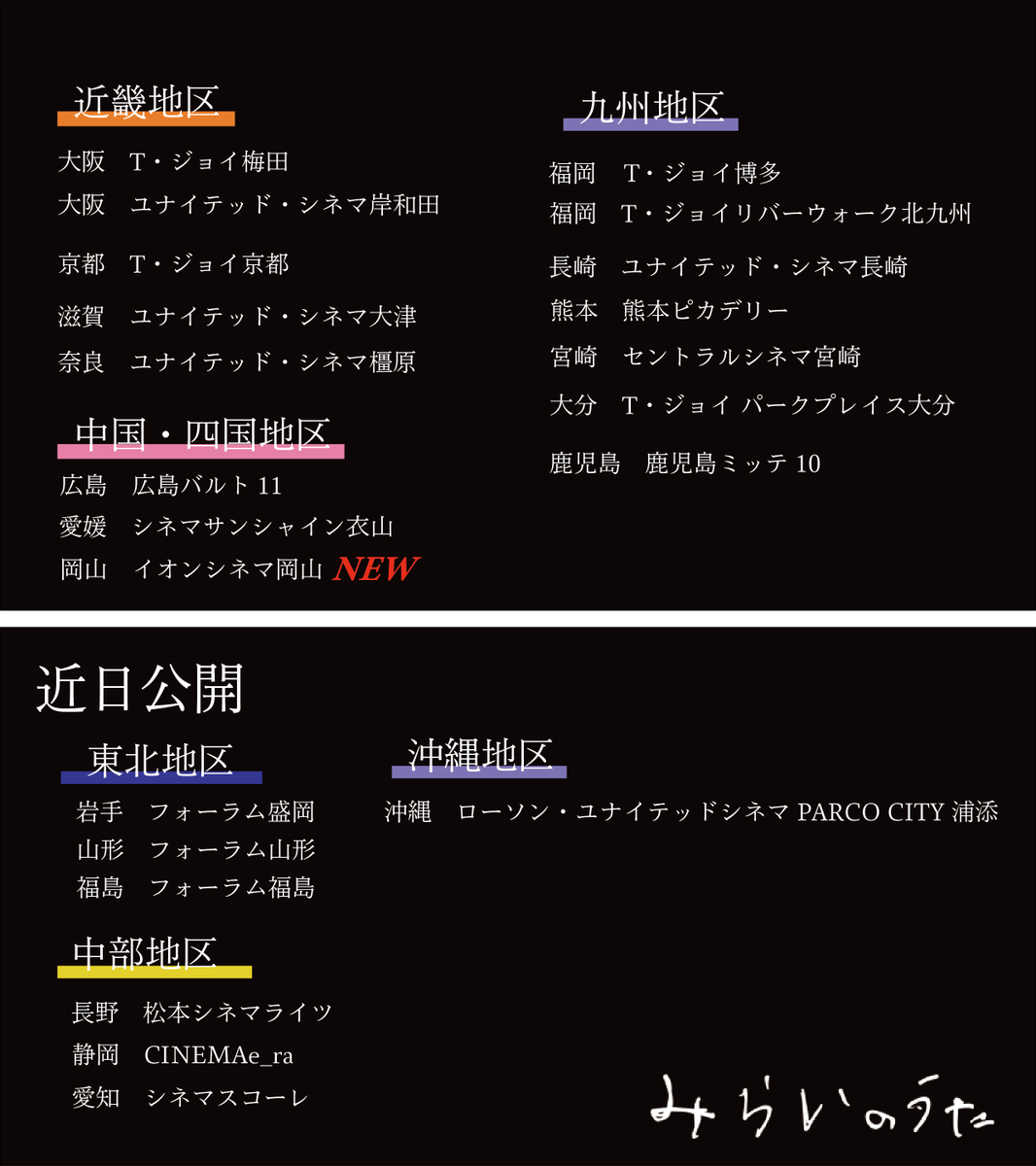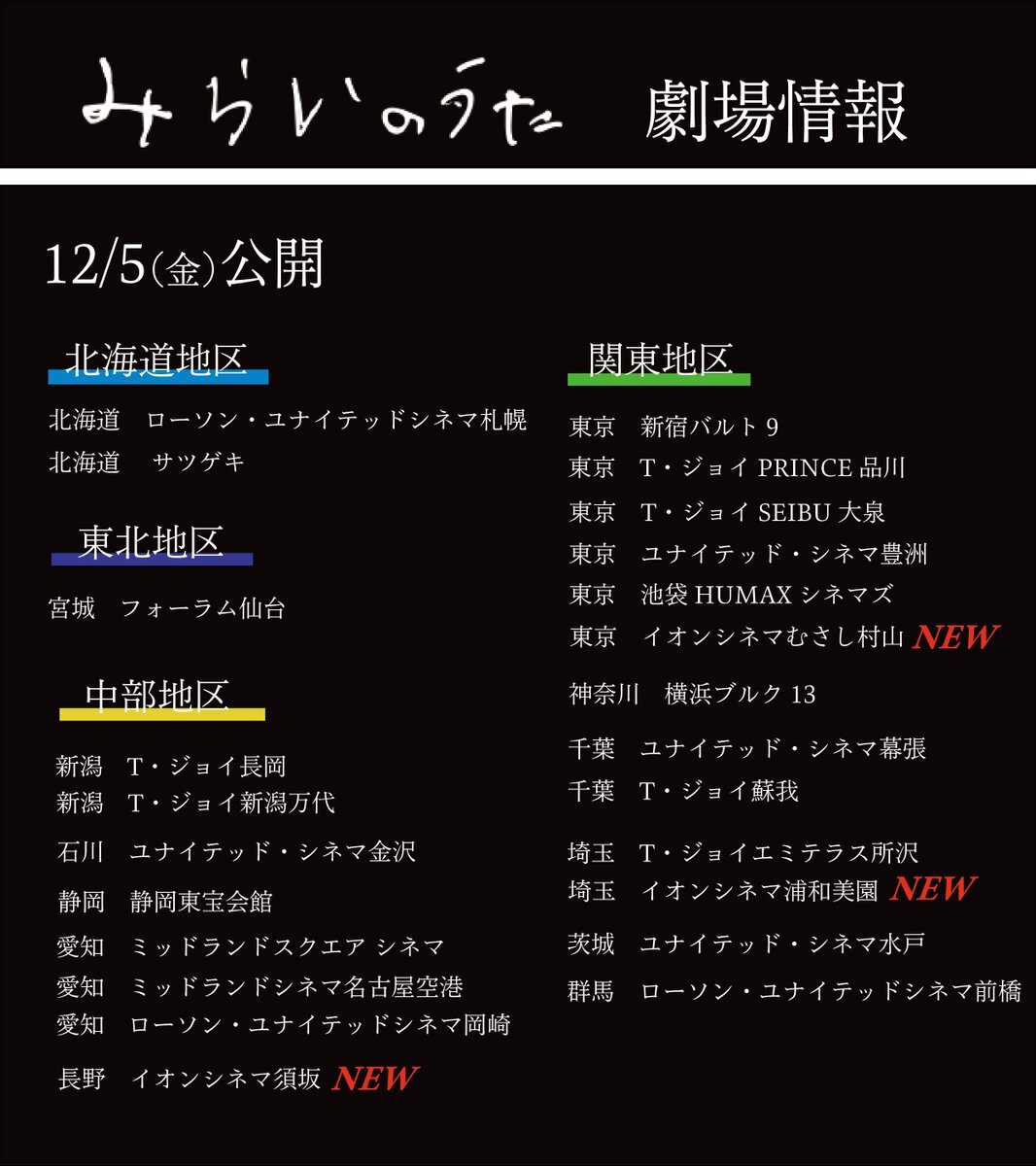 ◤◢◤◢◤ 劇場情報 追加UP!◢◤◢◤◢ 映画『#みらいのうた』 上映劇場が新たに追加されました! 【東京】イオンシネマむさし村山 【埼玉】イオンシネマ浦和美園 【長野】イオンシネマ須坂 【岡山】イオンシネマ岡山 10/31(金)より発売開始、 ムビチケ販売劇場と共に pic.x.com/IFdW8VtZkg