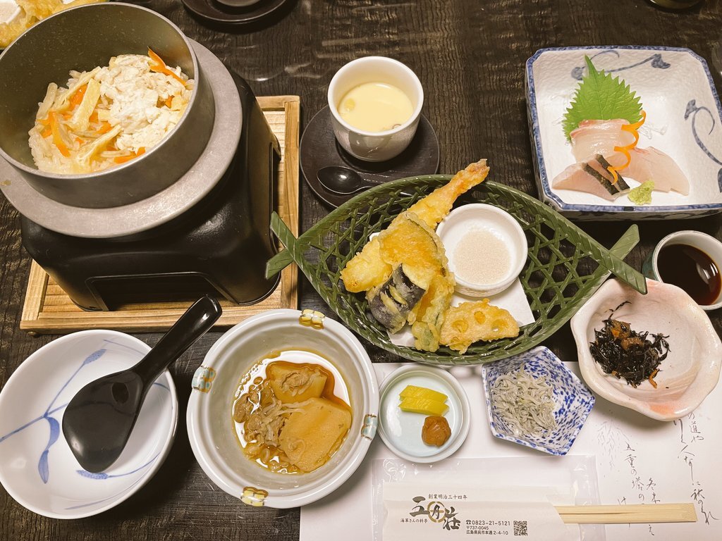 呉に今も残る海軍御用達料亭「五月荘」の昼食。鯛釜飯の御膳である。「肉じゃが海軍(呉鎮守府)発祥説」に基づいて肉じゃがの小鉢がついてるのはご愛敬(笑) x.com/KOYA_Makoto/st…