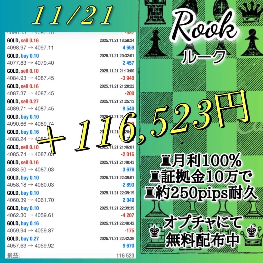 11月21日収支 ♜Rook♜ +116,523円(日利11.6%) ♟最低証拠金10万円で運用可能 ♟耐久性抜群(約250pips) ♟想定月利100% FX自動売買の無料EA配布 オープンチャット🎩 line.me/ti/g2/URyDL3Ps… 消費者物価指数 CPI パウエル 介入 ad pic.x.com/YuZvBBg2hK