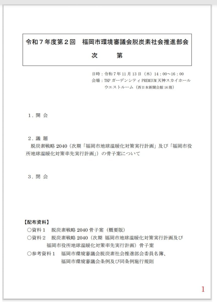 令和7年度第2回福岡市環境審議会脱炭素社会推進部会に出席。 脱炭素戦略2040【時期「福岡市地球温暖化対策実行計画」及び「福岡市役所地球温暖化対策率先実行計画」】の骨子案について。 議会からは大石修二議員、高木勝利が出席しました。 しっかり推進します! pic.x.com/pirEGEI5jG