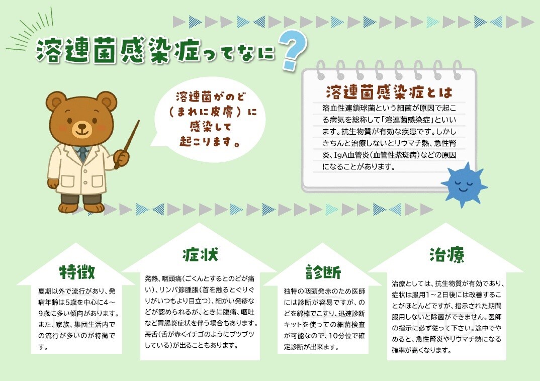 溶連菌感染症って?】 発熱・のどの痛み・苺舌🍓などが特徴です。 4~9歳の子どもに多く、家族や集団生活の中で感染が広がりやすい傾向があります。 抗生物質で治療可能ですが、途中で服薬をやめると腎炎などの合併症につながることも⚠️ 服薬は医師の指示通りにきちんと続けましょう💊 #練馬区 pic.x.com/cTeuvJyIvf