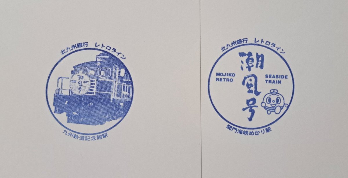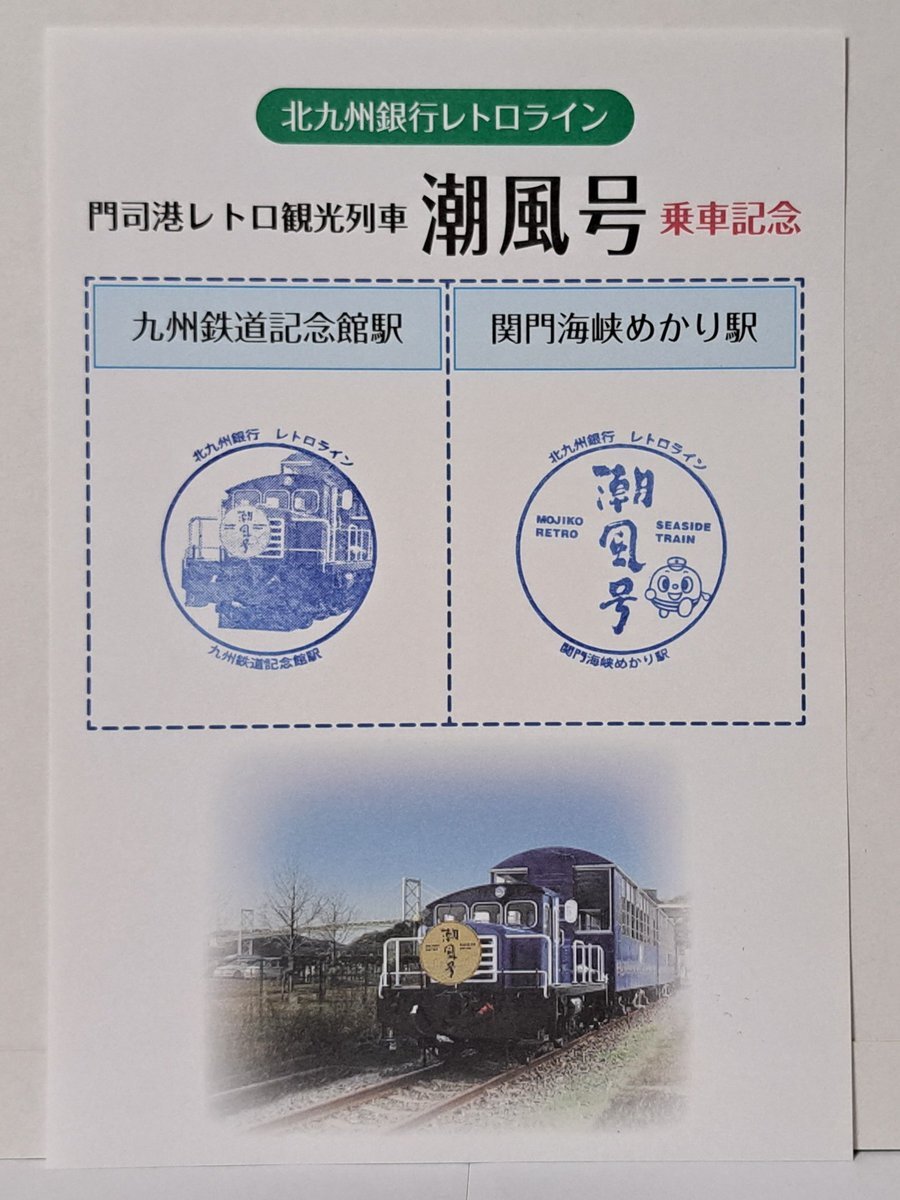 駅スタンプ 福岡県 北九州銀行レトロライン 門司港レトロ観光列車 潮風号 九州鉄道記念館駅 関門海峡めかり駅 各駅ともきっぷ販売所前設置 2023/08/12 押印 専用台紙にも押印。 日本一遅くて短い観光列車。 コロナで押せなくなっていた駅スタンプですが5/13より再開しています。 #駅スタンプ pic.x.com/PXyAI8OypU