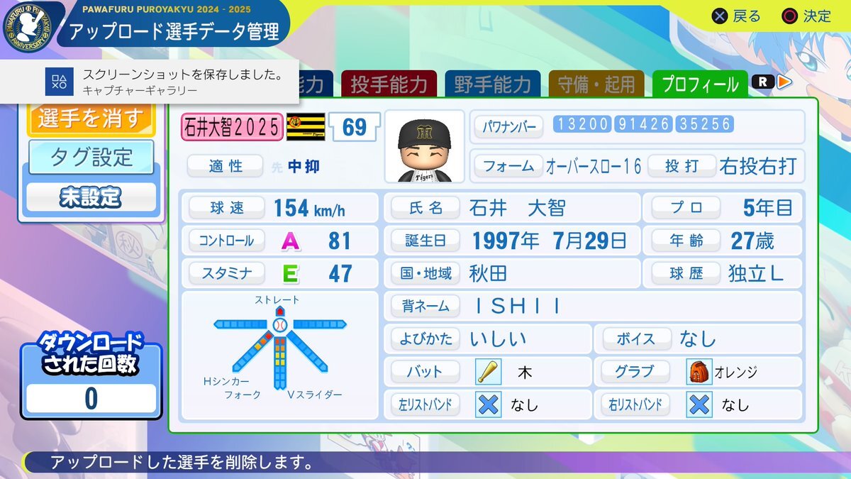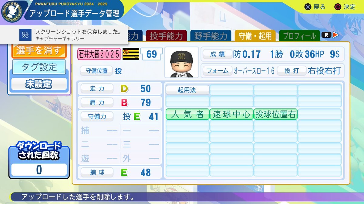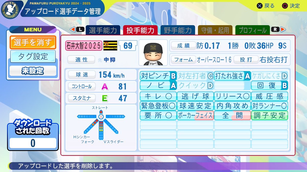 サクセスで、阪神タイガースの石井大智選手を作成しました。⚾🐯 世界記録かつNPB記録となる50試合連続無失点記録、球団記録となる49イニング連続無失点記録保持者で自責点はたった1点で、防御率0.17(防御率0.1点台はNPB史上初)と驚異的な記録を達成しました。 #パワナンバー pic.x.com/2NmI8wGVFO