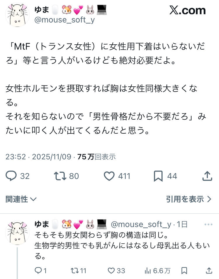 男性と女性は胸部骨格が全然違う。 女性ホルモンをいくら摂取しても骨格は変わらないから、女性用下着は合わないよ。 必要なのは、女性ホルモンを打った男性用の下着。 MTF に女性用下着は絶対不要。 胸部の脂肪だけでいうなら、ふくよかな男性だってブラ必要だけど、してないよね?それが答え。 x.com/mouse_soft_y/s…
