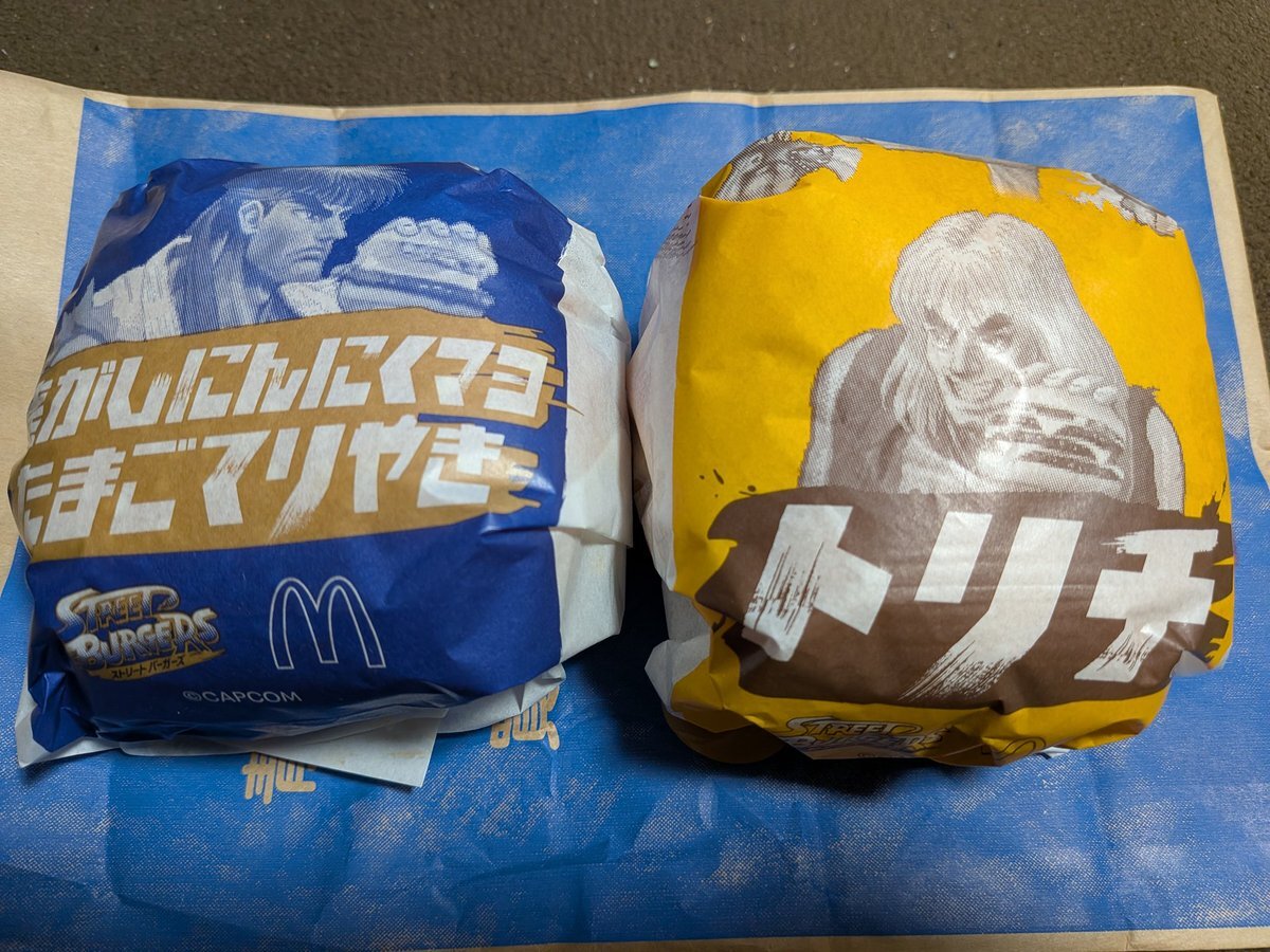 マックで残りのストリートバーガーズを食べる 焦がしにんにくマヨたまごてりやきの方は、なんか炭火焼き照り焼きがモランボン感があってこれリュウじゃなくてジュリちゃんじゃね…?ってなってる 油淋鶏マヨチキンの方は…フィレオと味が変わらんかもしれない 包み紙は楽しい!(ここの所みんな絵が違う pic.x.com/aIrL8TPW6G