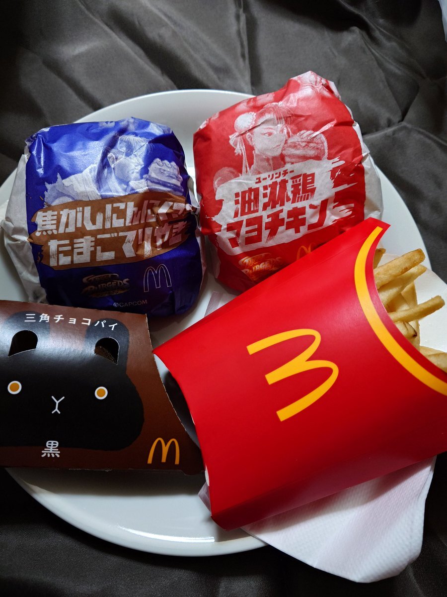 #焦がしにんにくマヨたまごてりやき #油淋鶏マヨチキン #三角チョコパイ黒 #マックフライポテトL 持ち帰って食べました。 pic.x.com/RdJlRZL2ns x.com/McDonaldsJapan…