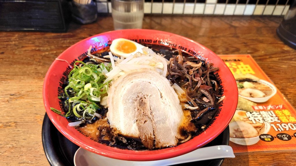 バスの遅延が拡大してるので急遽熊本県庁前で降りてたまたま目の前にあった味千拉麺本店で熊本ラーメン!(黒マー油) 決して濃いわけではないのに奥に旨味があってうまし pic.x.com/oQ4npERrfC