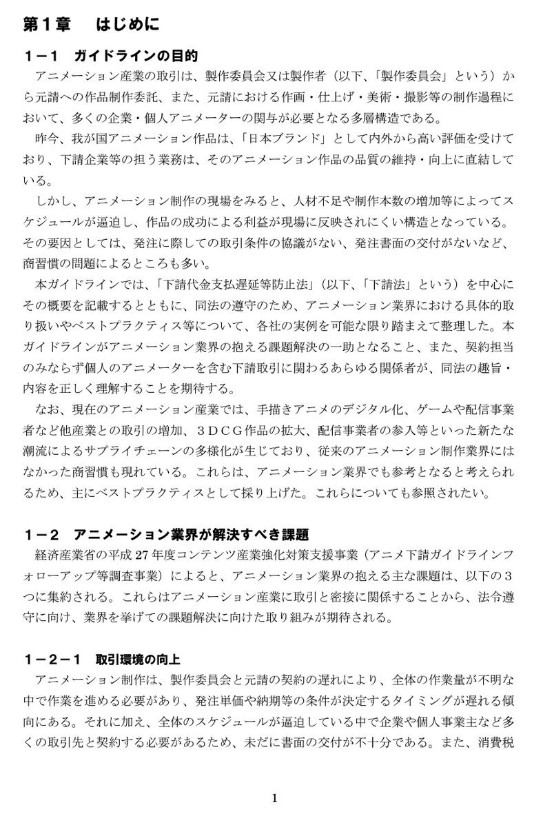 アニメ業界向け下請法 独占禁止法(優越的地位の濫用)ガイドラインを 中小企業庁が作成公開してます。 業界で省略されがちな発注見積もり手続きも 適切な書式参考載ってます。 フリーアニメーター、制作進行、プロデューサーは これ参考に取引健全化適正化を図れるかと。 chusho.meti.go.jp/keiei/torihiki… pic.x.com/ydq1gi1xJG
