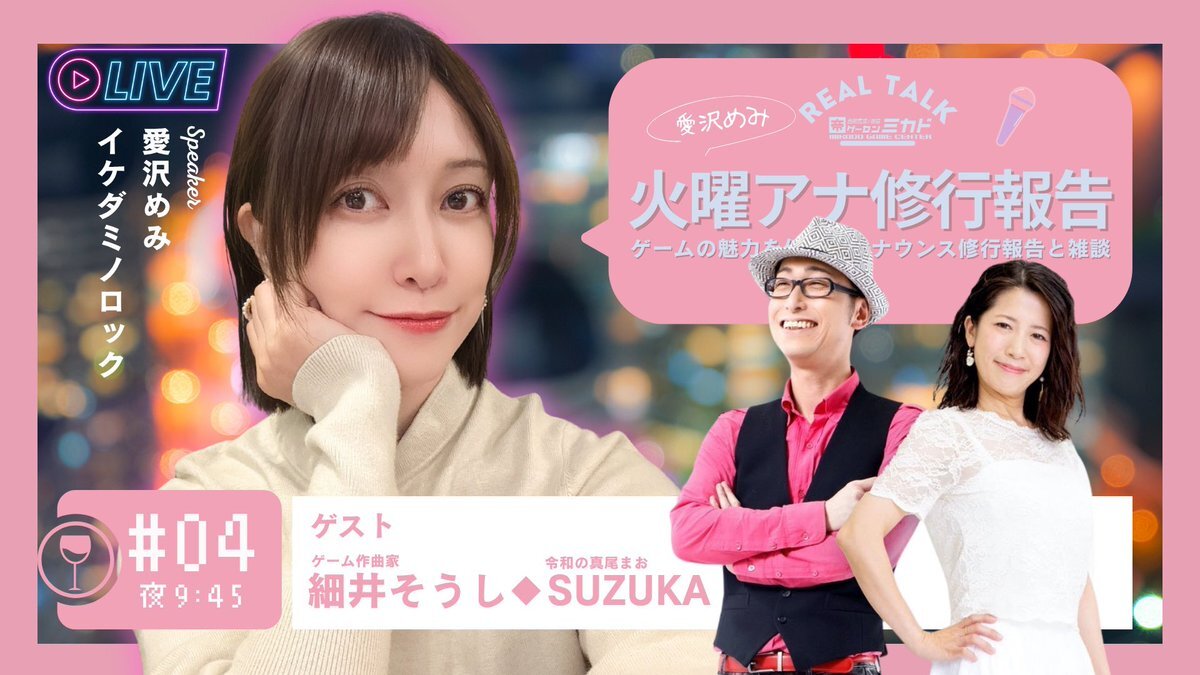 火曜日の夜は⁉️ 『愛沢めみ 火曜アナ修行報告』 🌙夜9:45〜 出演:愛沢めみ、イケダミノロック ゲスト:細井そうし、SUZUKA(敬称略) 愛沢の修行スキルがどこまで進んだのか、どんな活動をしているのかまったりおはなしする番組に、迫る #ゲースキ にご出演のお二人が登場! m.youtube.com/live/K0kbTNOAW…