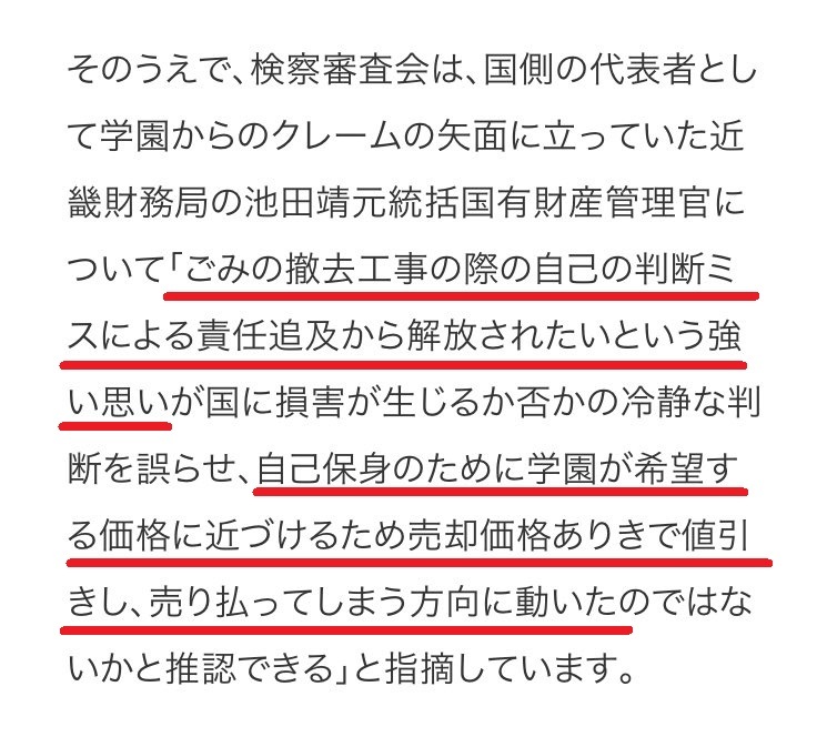 返信先:@Kanao_CatsHope_2値引きの原因となったのは、事前工事で見つかったゴミを黙って埋め戻したのがバレて、損害賠償請求を避けるため&瑕疵担保責任免責によるものです。 籠池氏も証人喚問でゴミが原因と明言しています。 土地取引の責任者かつ故人を書き換えに巻き込んだ上司の不手際だと検察審査会でも指摘されてますよ。 pic.x.com/Hqqq5MWFec