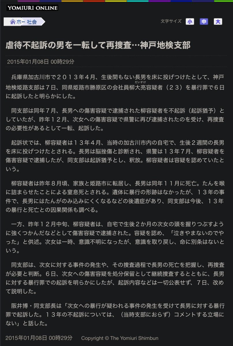 見つけた、次女を虐待した元夫 こいつ長男も殺してる 柳大亮(当時23) 2013年、生後間もない長男を床に叩きつけ脳挫傷を負わせる ↓ 暴行容疑で逮捕され容疑を認めたが、謎の不起訴で釈放 ↓ 2014年、長男が後遺症によりたんを詰まらせ窒息死 ↓ x.com/females_db_par…