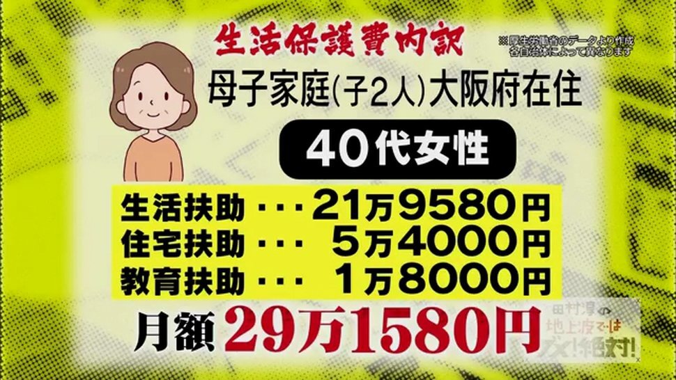 大阪府大阪市 子供が小学生2人で計算しました。 図の生活扶助が家賃扶助込みの金額です。 生活保護費242230 円 内訳 生活扶助基準額146250 円 障害者加算0 円 母子加算23600 円 児童養育加算20380 円 住宅扶助基準額52000 円 ※持家の場合は支給されません。 ※実際の家賃の額が支給されます。 x.com/airi_fact_555/…