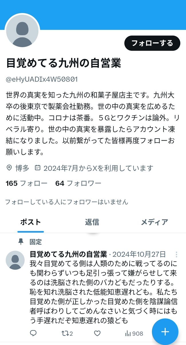 ご自身の発言内容も忘れまくりで、罵倒の語彙も貧弱すぎるうえ、「生産性」とはまるで縁がなさそうな、自称九大出身者の反ワクチンくん。まさに国費の無駄遣い。 「目覚めてる」らしいんだけど、これじゃあ覚醒剤とJWの「目ざめよ!」を思い出してしまう案件。 pic.x.com/EKbg64unEM