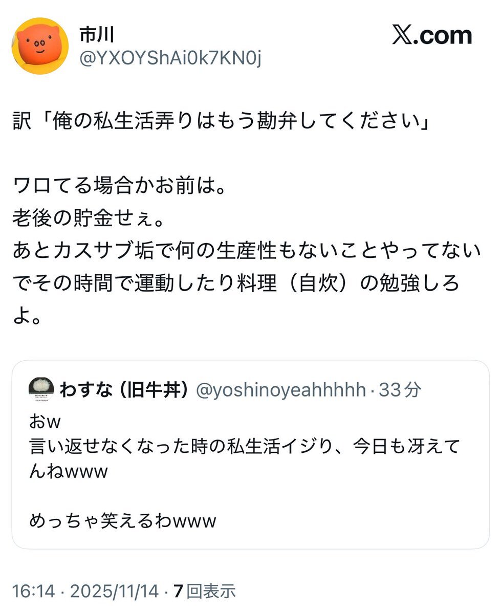 訳「俺の私生活弄りはもう勘弁してください」 ワロてる場合かお前は。 老後の貯金せぇ。 あとカスサブ垢で何の生産性もないことやってないでその時間で運動したり料理(自炊)の勉強しろよ。 x.com/yoshinoyeahhhh…
