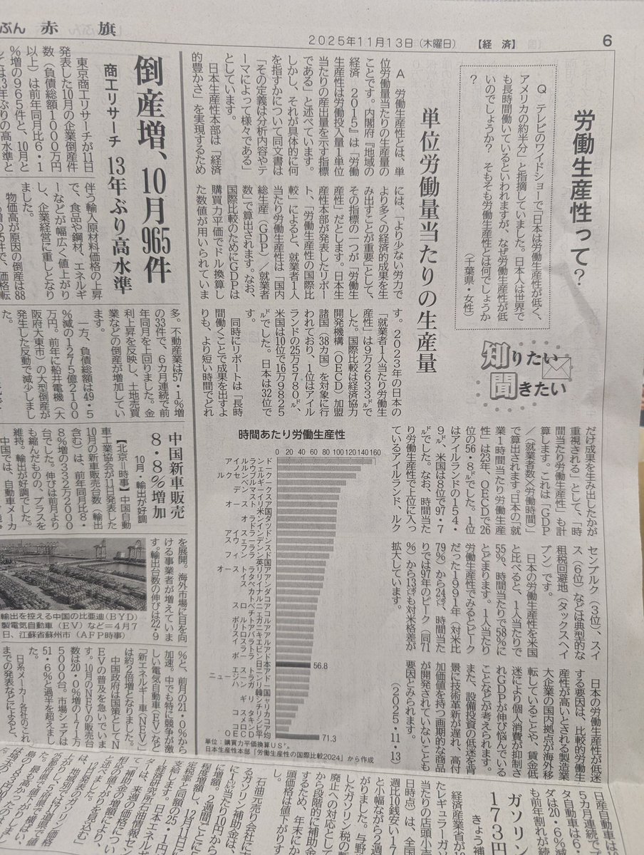 今日の赤旗6面、労働生産性。 労働生産性とは単位労働量あたりの生産量のこと、1人あたりの労働生産性はGDP/就業者数で算出されます。 現在日本は32位、ピークだった1991年から24ポイント減。 生産性の高い製造業の拠点が海外移転していることと個人消費の落ち込みが原因です。 #日本共産党 pic.x.com/VnWmtJbQGM