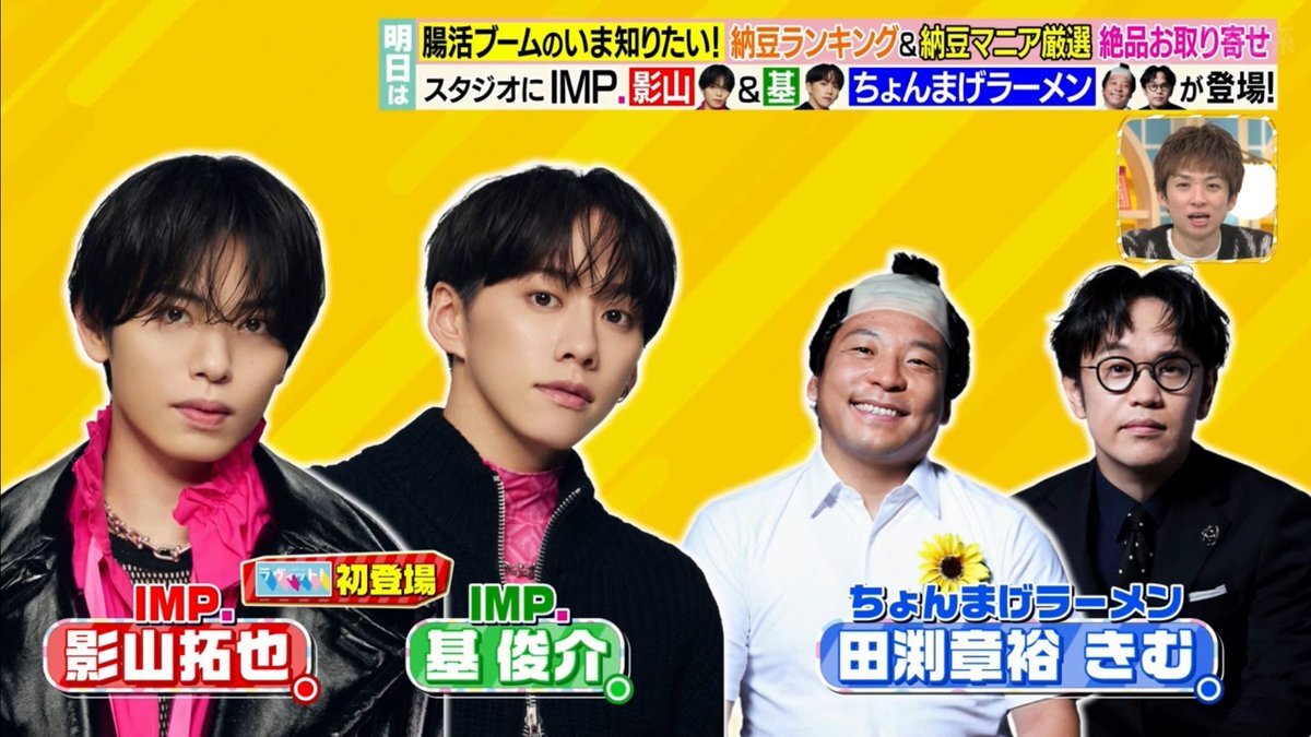 #1181 11月19日水曜日 #次回ラヴィット予告(最新版) 1.ゲスト出演者 ➀パネラー席ゲスト ・"IMP"影山拓也さん ・"IMP"基 俊介さん ・ちょんまげラーメン(田渕章裕、きむ)さん ※月曜日のラヴィットランキング(VTR出演)以来今週2勤目