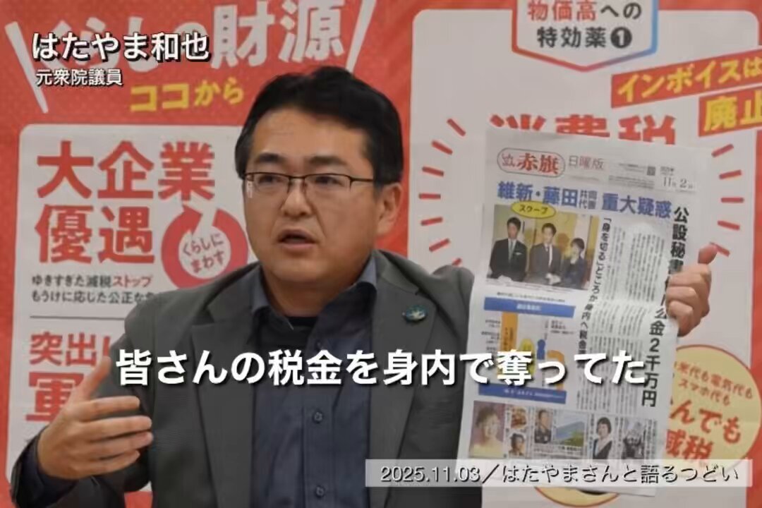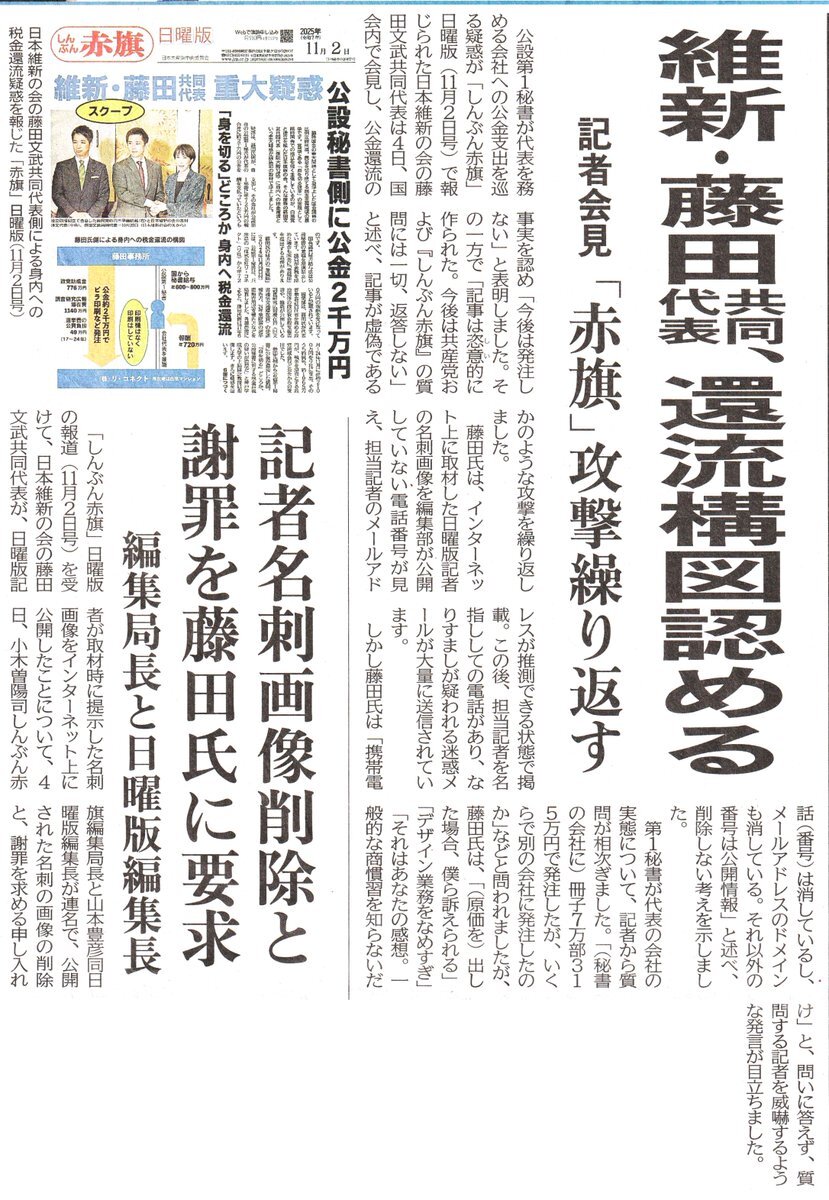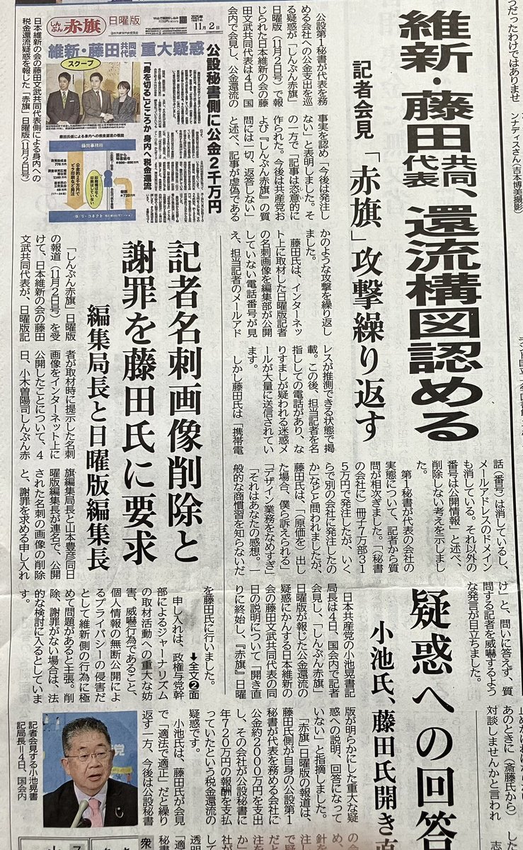 【しんぶん赤旗チェック11.5】維新の藤田共同代表が「税金還流疑惑」で記者会見。還流構図を認め「今後はしない」と表明しつつも、開き直りと新たな恫喝を繰り返し、「今後は赤旗の質問には返答しない」と逆ギレ。一方、赤旗は同氏がXに投稿した記者名刺画像削除と謝罪を同氏に要求。法的措置も検討。 pic.x.com/4f5JTvDgSP