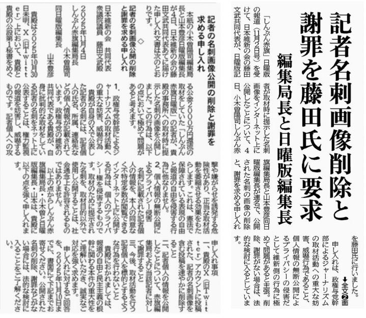 「政権与党幹部によるジャーナリズムの取材活動への重大な妨害、威嚇行為であり、個人情報の無断公開によるプライバシーの侵害。維新側の行為に極めて問題がある」。「記者名刺画像削除と謝罪を藤田氏に要求/編集局長と日曜版編集長」 #しんぶん赤旗 jcp.or.jp/akahata/aik25/…