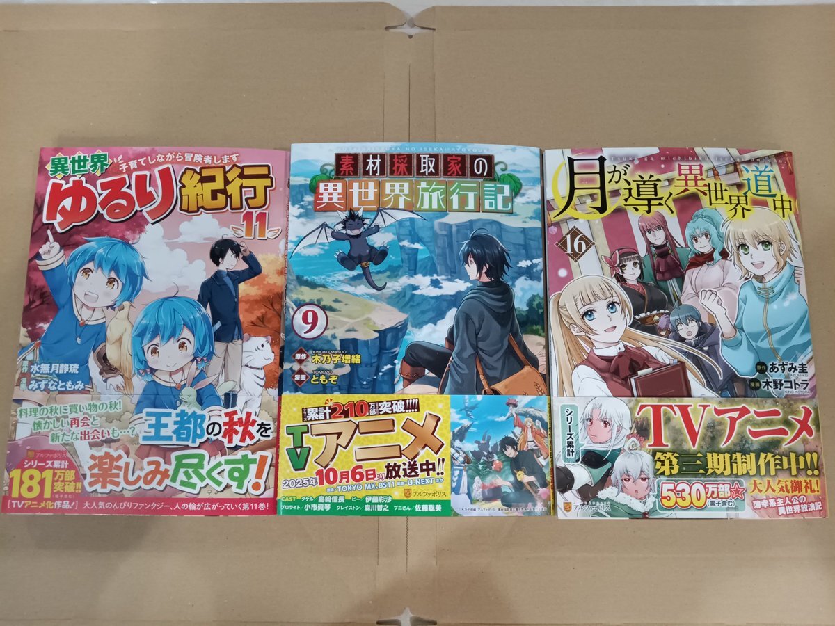 本日届いたコミック 異世界ゆるり紀行 〜子育てしながら冒険者します〜11巻 素材採取家の異世界旅行記 9巻 アニメ見てるけどやはりビーは可愛い 月が導く異世界道中 16巻 TVアニメ第三期楽しみです! pic.x.com/qbU4GShgmv