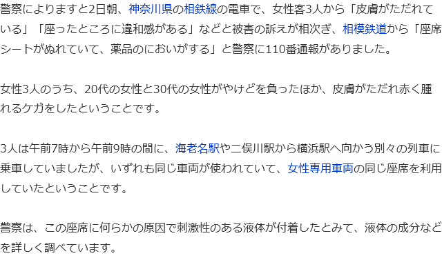 【調査中】「皮膚がただれてる」相鉄線で訴え相次ぐ、「座席がぬれて薬品の臭い」と警察に通報 news.livedoor.com/article/detail… 女性客3人から被害の訴えが相次いだ。3人は午前7時から午前9時の間に別々の列車に乗車していたが、いずれも同じ車両が使われていて、同じ座席を利用していたという。
