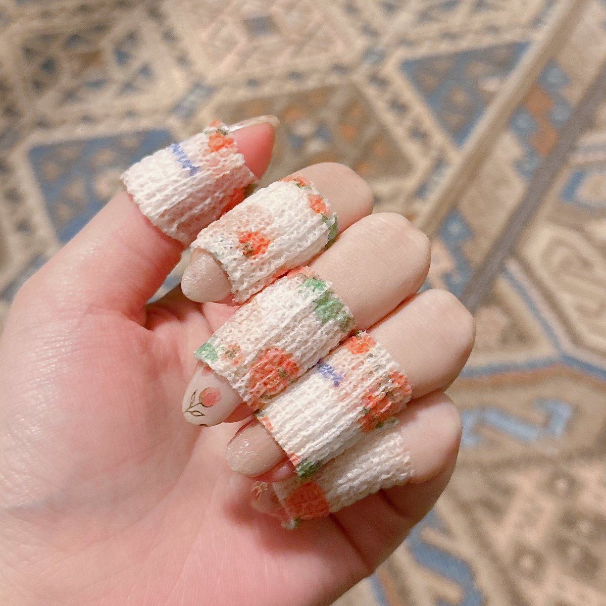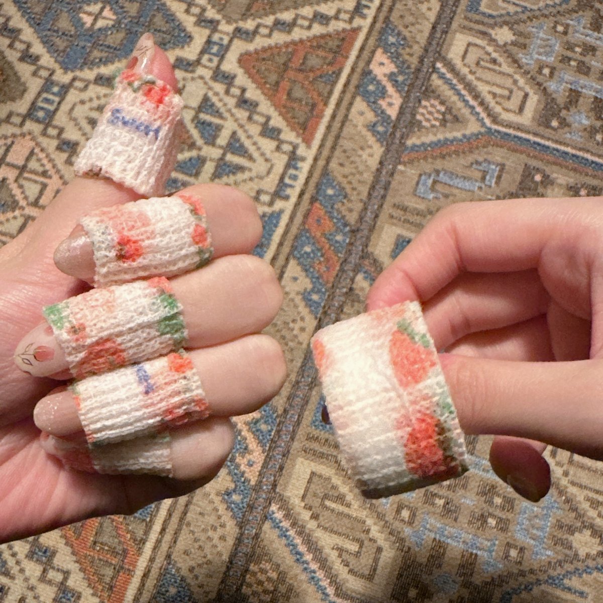 皮膚むしり症の対策に購入したテープは「自着包帯」って名前なんだって。リプ欄で教えていただきました。私の付けてるのはネットで購入したけど"指保護テープ"で検索したら出てきたよ!通気性あって指があまりふやけなくて良い pic.x.com/pwruh78awm