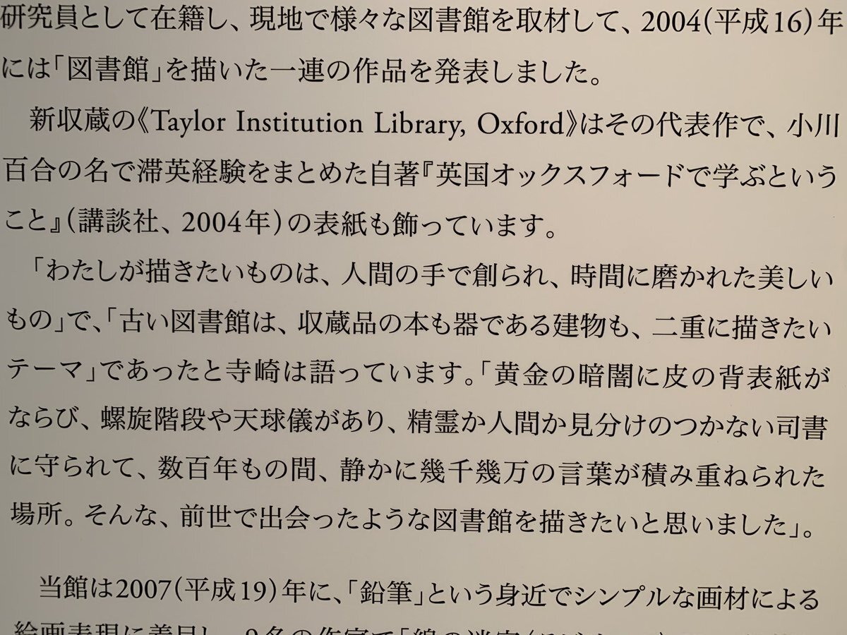 目黒区美術館コレクション展  新収蔵品を中心に+清原啓子の銅版画 多和圭三でこの美術館の空間的魅力を、清原啓子でコレクションの深みを、そして寺崎百合子でこの美術館の存在意義を示した、と僕は勝手に思ってる。 写真は寺崎の作品に添えられキャプション。図書館を美術館に変えても通じる。 pic.x.com/tFfCNq1wuu