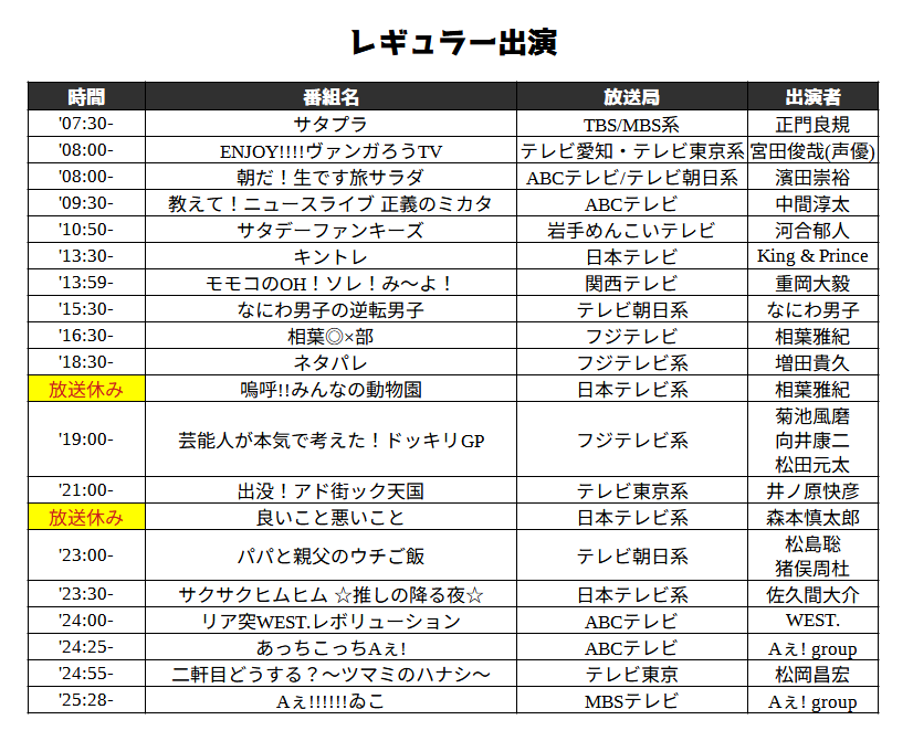明日11/29出演 ▼05:45- ●夜明けのラヴィット!(TBS系) 宮舘涼太 ▼05:55- ●シューイチ(日本テレビ系) 七五三掛龍也 松倉海斗 ▼06:00- ●めざましどようび(フジテレビ系) 嵐 SUPER EIGHT 山田涼介 髙橋海人 松村北斗 目黒蓮 ラウール ▼11:59- ●サタブラ~SATURDAY pic.x.com/625EHAbhn9