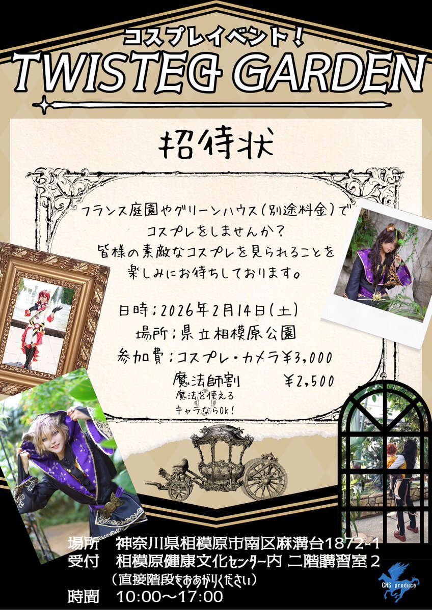 🦁 TWISTED GARDEN2 🐆 日時 2026年02月14日 土曜日 受付 相模原健康文化センター2階 住所 相模原市南区麻溝台1872-1 開催時間 10:00〜17:00 更衣室受付終了時間 16:30まで ※必ず更衣室に16:30までにお戻りください。 ♥️コスプレイヤー&カメラマン♦️ 魔法師割引 2500円(当日配布なし)