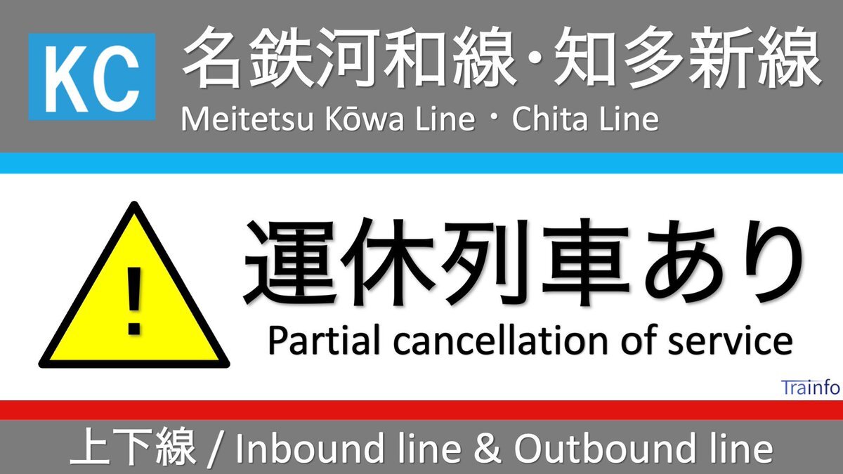 【名鉄河和線・知多新線 上下線 遅延情報】 河和線と知多新線は、富貴~上野間での工事車両脱線の影響で、富貴〜太田川の上り線の一部列車に最大5分程度の遅れがでています。太田川~河和・富貴~内海の上下線で一部列車が運休となっています。 pic.x.com/o3FqHZw2SY