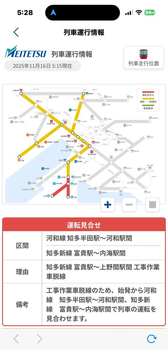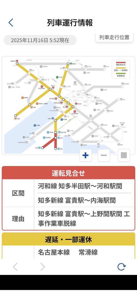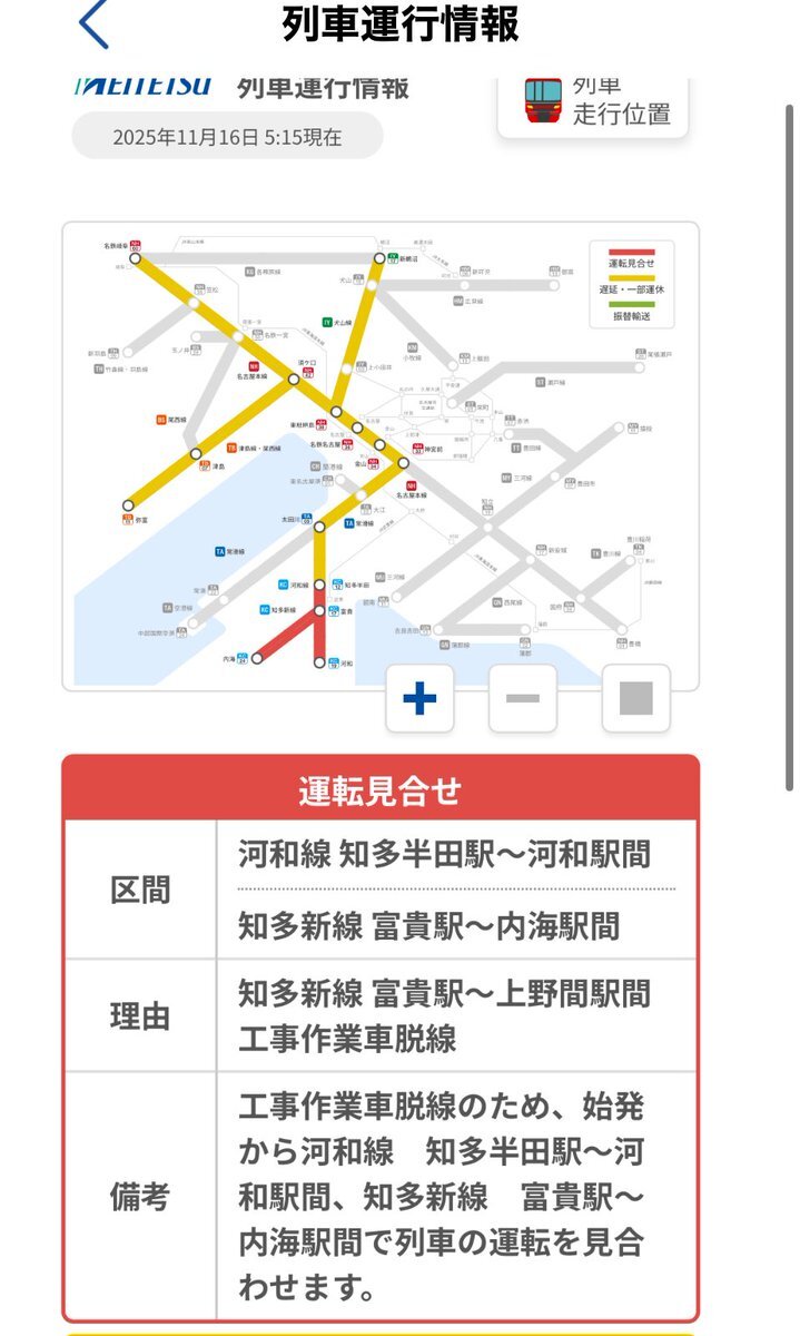 路線名:名鉄河和線・知多新線 富貴〜上野間駅間で発生した作業車トラブルの影響で、知多半田〜河和駅間、富貴〜内海駅間の運転を見合わせています。運転区間の一部列車に遅れや運休が出ています。 (11月16日5時34分現在)