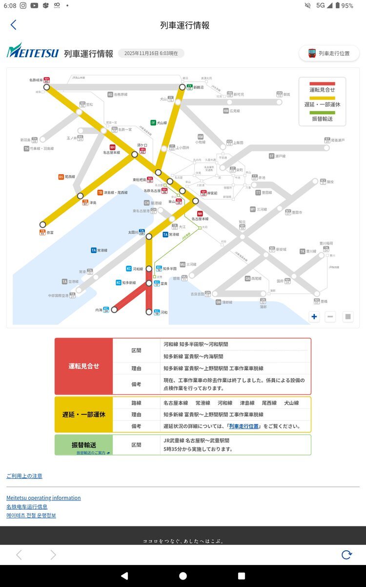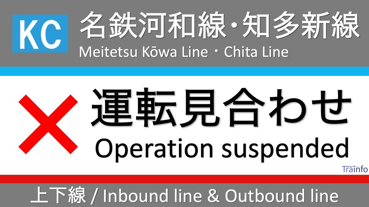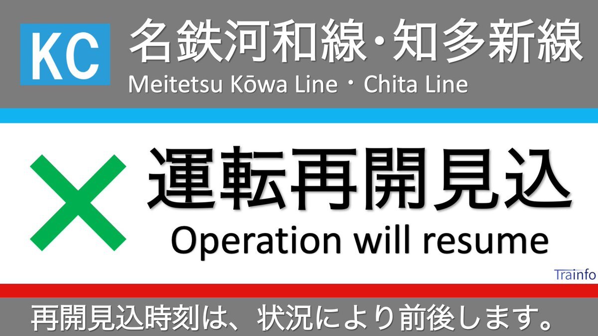 ------------- 名鉄河和線・知多新線 運転見合わせ(11月16日 05時30分掲載) 詳細はこちら→transit.yahoo.co.jp/traininfo/deta… [Yahoo!乗換案内] ↓ アプリのダウンロードはこちらから transit.yahoo.co.jp/smartphone/app… -------------