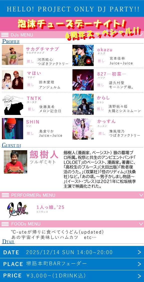 【超リポスト希望】 #泡沫チューズデーナイト! 6周年スッペシャル!! 今回遂に!イベント初のゲストDJ 劔樹人さんに出演して頂きます! 映画『あの頃。』を見た日からいつかは出てもらいたいと思ってました! いつものDJsと最強フード&ドリンク、そして1人っ娘。と待ってます! 伝説の日にしよう!