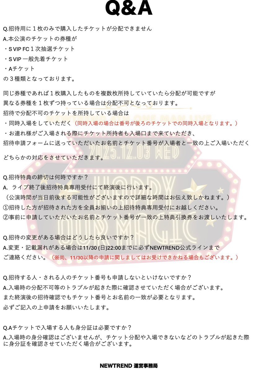 『NEWTREND 4th ONE MAN LIVE Happy Our Magic』お問い合わせについて 1枚目画像をご一読ください。 その他お問い合わせはNEWTREND公式ラインにて✉️ ▷12/3(水) ▷品川ステラボール ▷OPEN17:00 / START18:00 ▷チケット情報 S VIP ¥20,000-(前方3列100席限定) Aチケット ¥4,000- 詳細はこちら▽