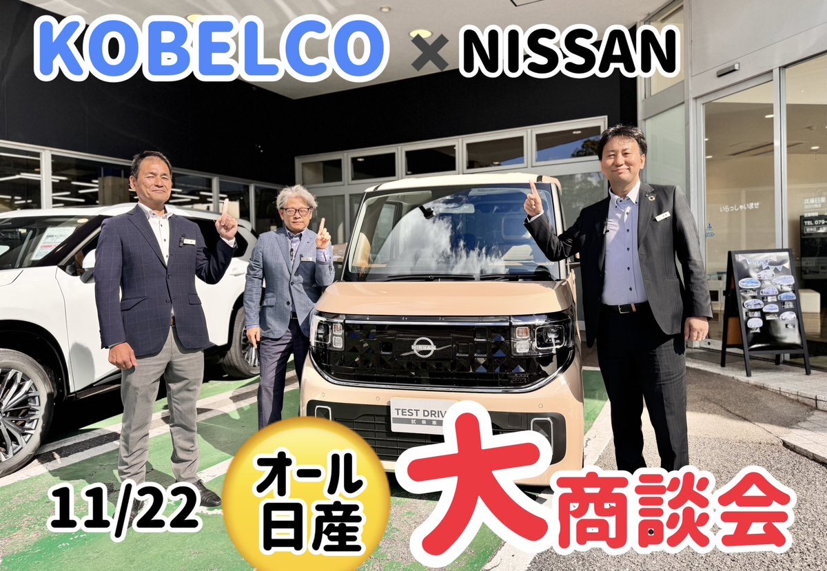 こんにちは😃加古川平野店、店長の惣輪です🏊 11月22日KOBELCO✖️NISSAN大商談会を神戸製鋼所 加古川製鉄所様にて開催致します。 #日産#兵庫日産#チーム加古川#加古川平野店#加古川中央#加古川#神戸製鋼所様#加古川製鉄所様#吉成#澤田#惣輪#ルークス#エルグランド#リーフ#エクストレイル#日本一#22日 pic.x.com/8PFwOSc3kV