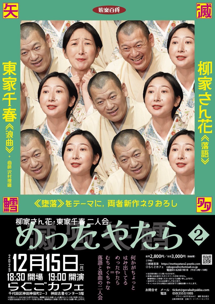 【ご予約受付中】 柳家さん花・東家千春二人会 「めったやたら2」 12月15日(月) らくごカフェ 19時開演(18時30分開場) 《堕落》をテーマに 両者、新作ネタおろし 料金 予約2,800円 (当日受付順にご入場) ①娯楽百貨 mettayatara2.peatix.com ②らくごカフェ rakugocafe@hotmail.co.jp