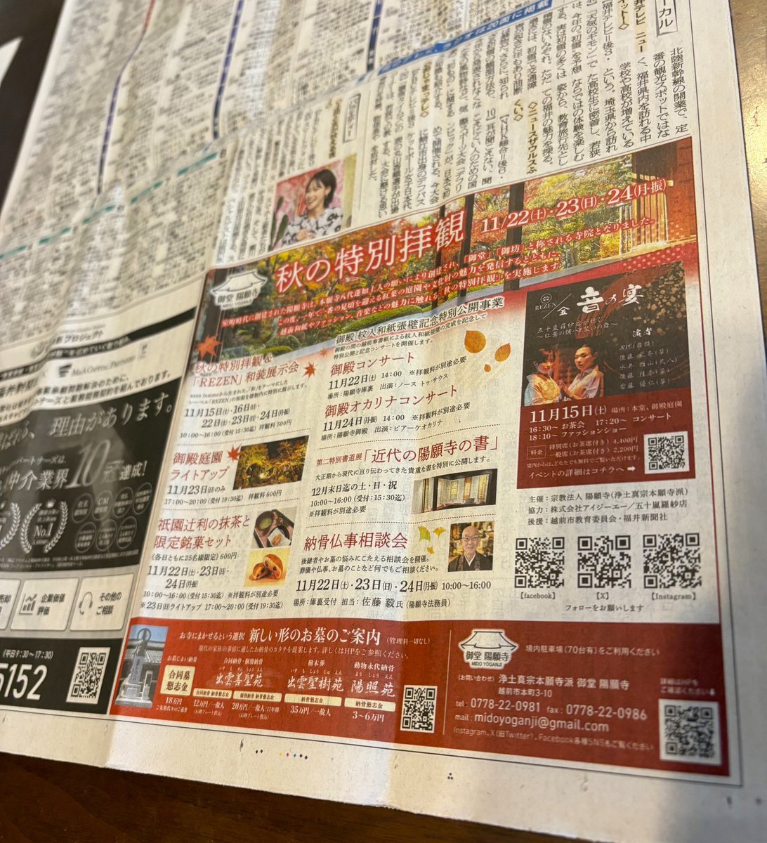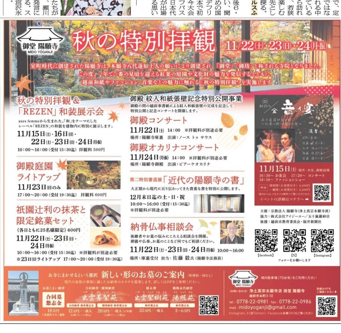 11月22より開催の「2025年秋の特別拝観」が掲載 本日11月12日(水) 福井新聞社テレビ欄に 掲載されました ☆秋の特別拝観&「REZEN」和装展示会 越前市から発祥したアパレルブランドaxesfemmeを運営する(株)アイジーエーからのブランド「REZEN」和装展示会を開催。 pic.x.com/8wHzOmFY4W