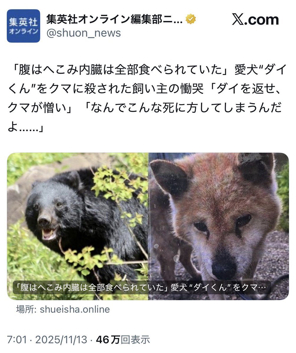 生身の人間がクマに食い荒らされた、ご遺体発見のニュースもPTSDだよ💧 最近の話しです。 過去でいえば三毛別羆事件や、福岡大学ワンダーフォーゲル部ヒグマ事件とか、ホラーどころの恐怖じゃない。 x.com/CvqRluwg/statu…