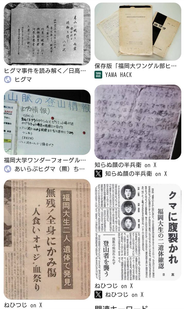 福岡大学ワンダーフォーゲル部ヒグマ事件っていう名前でWikipediaにあって(1970年)「クマが人を襲った例がなかった」とか「これを機に恐れられるようになった」とか多いですが それより先に三毛別羆事件(1915年、これもWikipediaにある)が起きてるので実はクマが人を襲うのは既出だったんですよね