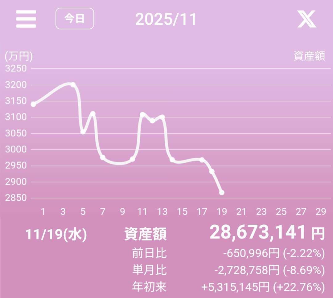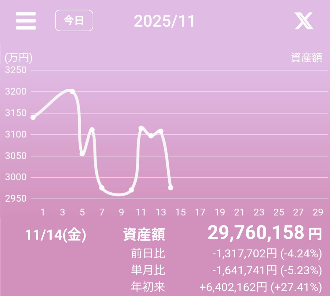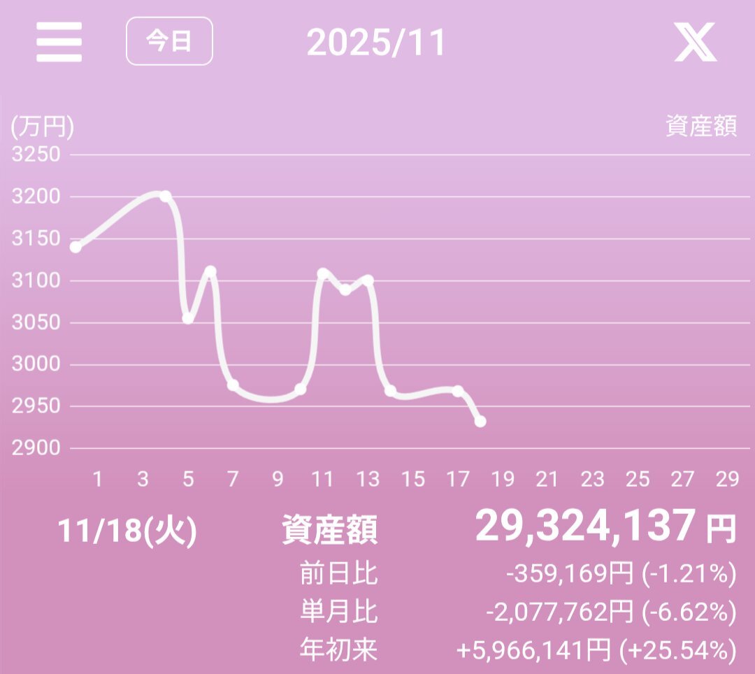 / おはひよーっ😈✨ \ NASDAQ100は前日比-2.05%、ドル円は-0.14%となりました!100日移動平均線乖離率は+4.05%です。 政府閉鎖は解除されましたが、利下げ期待が遠のき大きく下落しました💦 ブロードコム-4.29%、AMD-4.22%と半導体の下げが目立ちましたね。 さぁ金曜日、今週ラストです😊✨️ pic.x.com/1koTWdk5Qn
