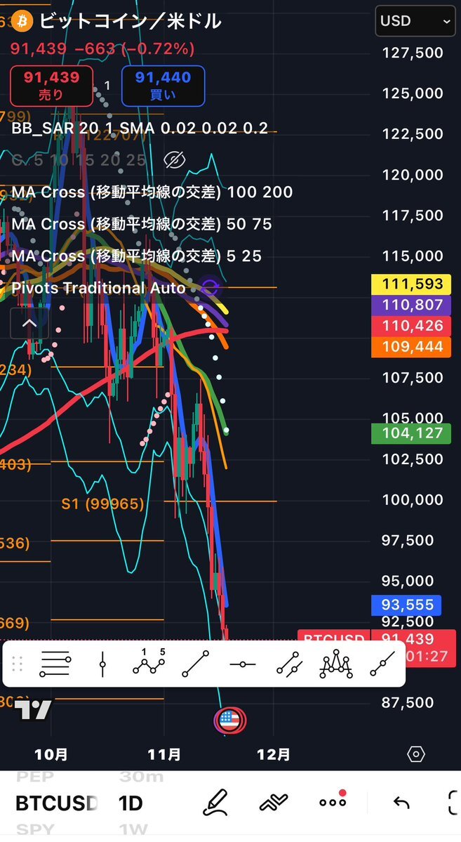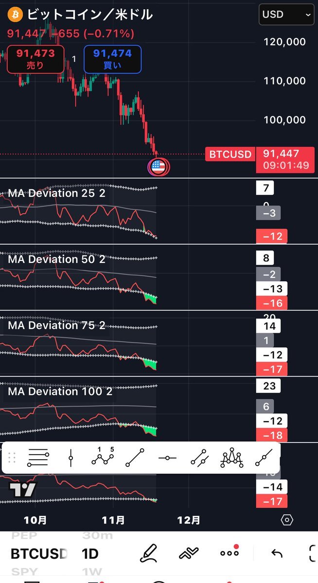 11/17 Action 金、インド、ベトナムに続く、移動平均線乖離率を基準にした積み立て第四弾。まだまだデッドクロスがブッ刺さってくるけど、こういうのは反転すると心理的に入れなくなるので、今から小さくコツコツやってみよう。 $BTC pic.x.com/F3cbzHjrMI