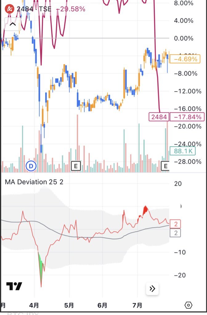 スイングトレード手法で結構再現性あって期待値積めるのがtrading viewの移動平均線乖離率とポリンジャーバンドの異常を視覚的に確認できる【Moving average deviation rate】って奴で重宝してたなぁ pic.x.com/n3U4TGlPoL