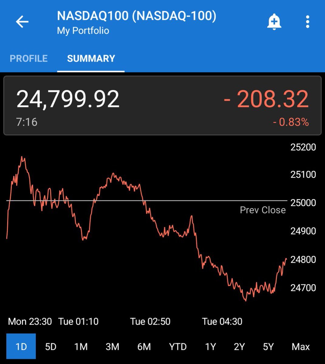 / おはひよーっ😈✨ \ NASDAQ100は前日比-1.20%、ドル円は+0.18%となりました!100日移動平均線乖離率は+1.71%です。 株価は続落。エヌビディアの決算を控え、手仕舞いする人が増えたのでしょうか。私は上がっても下がってもすべて受け入れます! 今日もよろしくお願いします✨️ pic.x.com/IsWePJDEdk