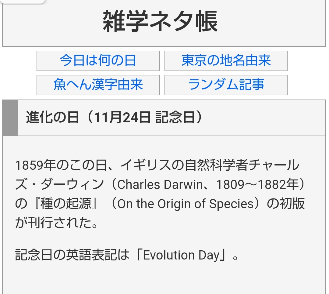 昨日11月23日(日)が勤労感謝の日で、今日24日(月)はその振替休日であった……と。それでは今日自体は何の日かと調べたら、国際的には1859年にダーウィンの『種の起源』が発表されたことから「進化の日」だそうです。Evolution is a mystery... ▶Line In The Sand (Evolution) youtube.com/watch?v=CxUkjL…